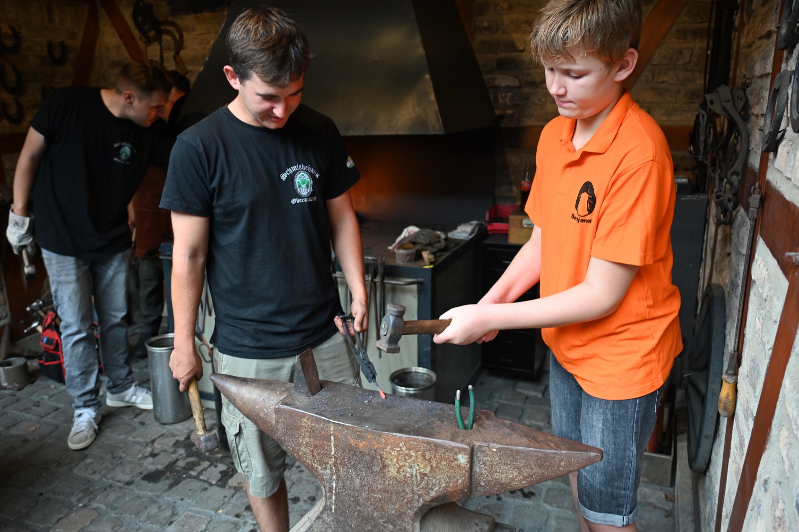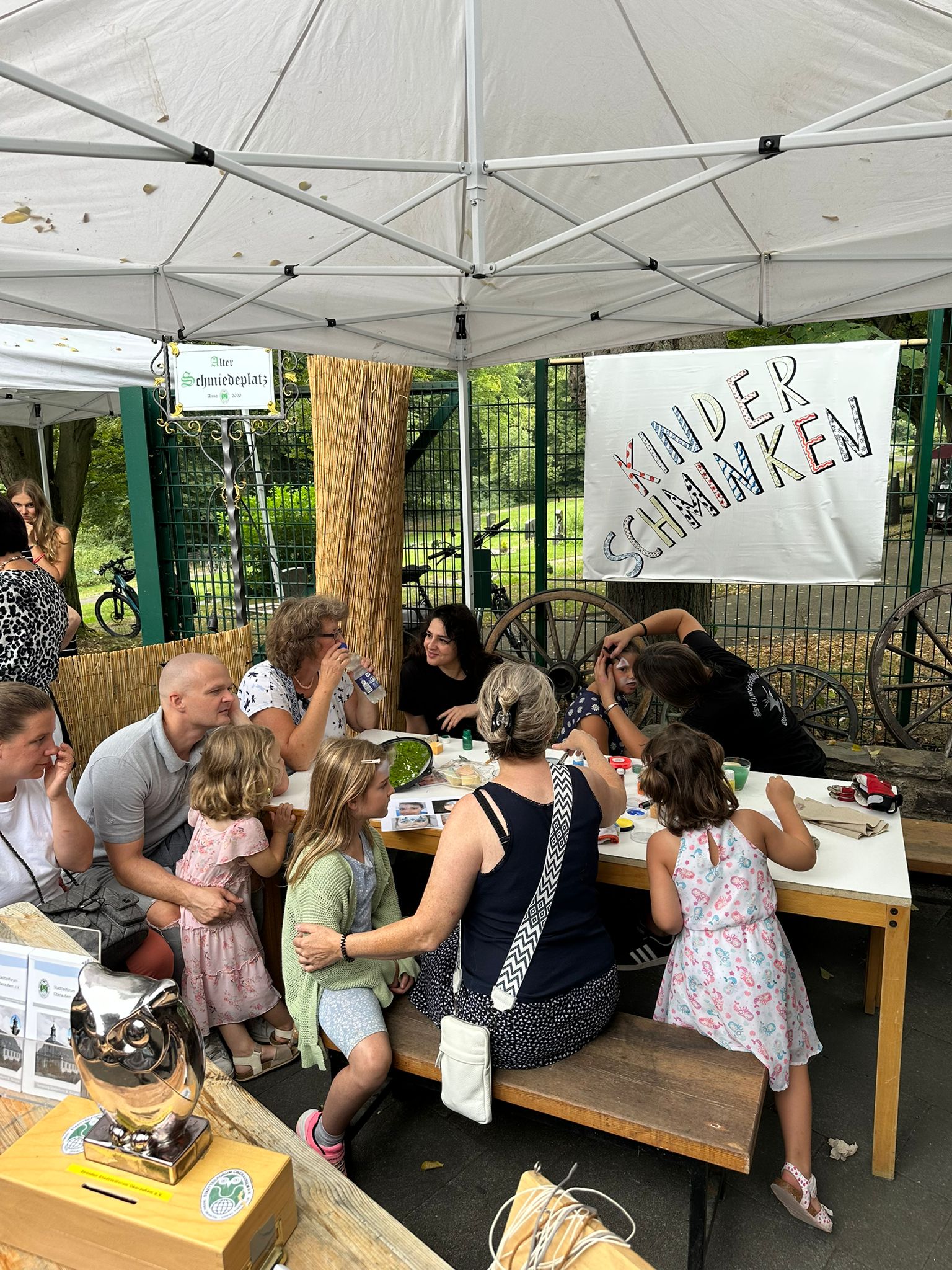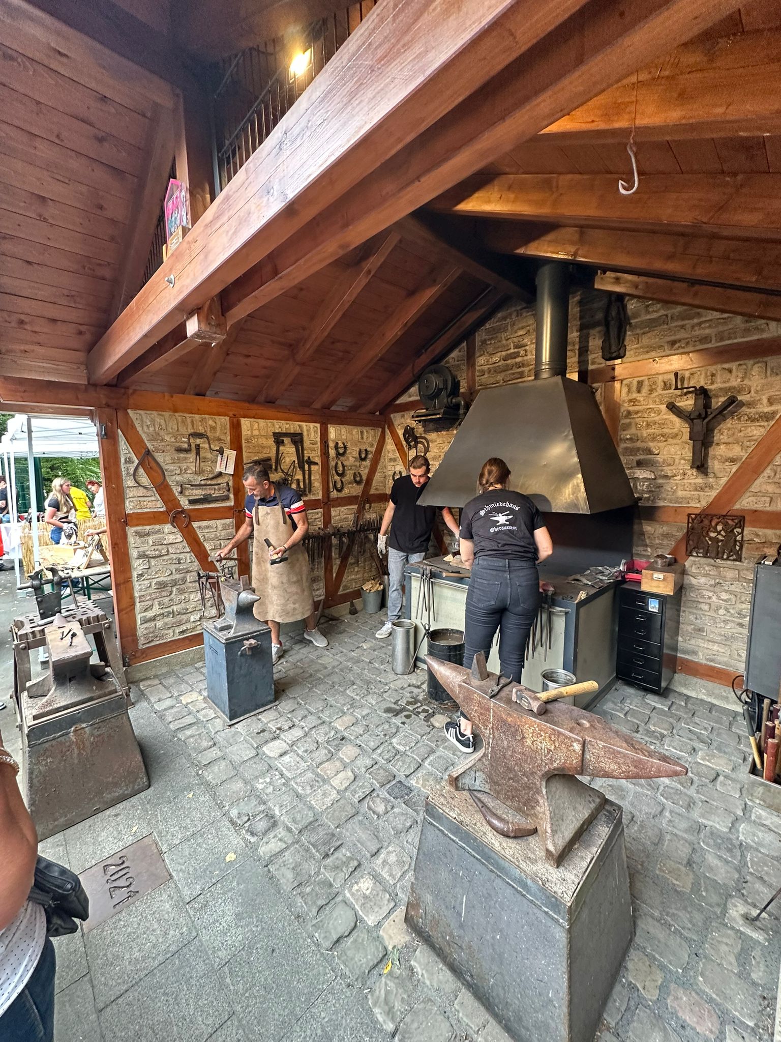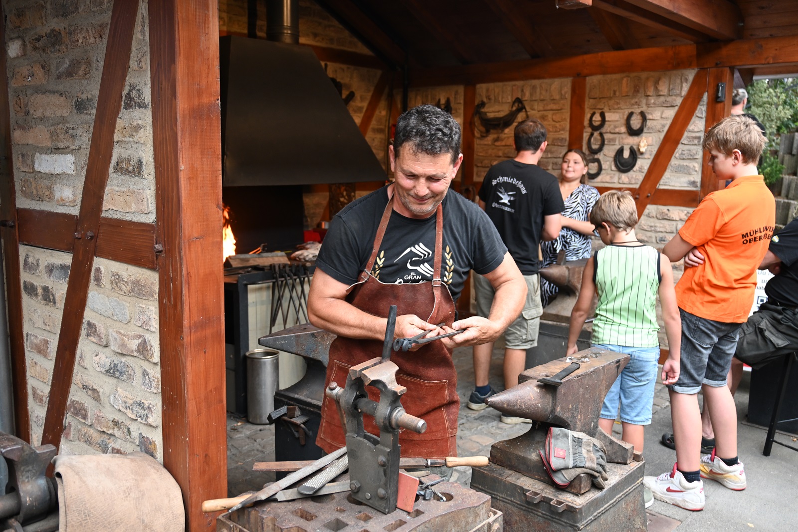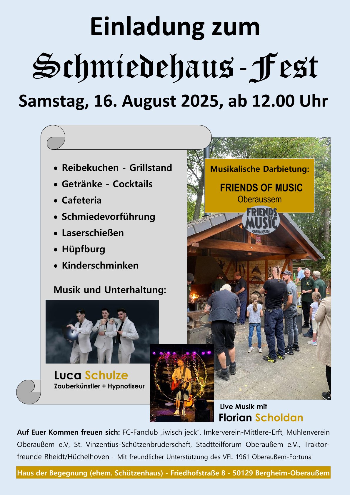In diesem Jahr fand bereits das fünfte Schmiedehaus-Fest unter Beteiligung der sechs ansässigen Vereine vom Haus der Begegnung statt. Das Schmiedeteam erstellte bei ihren Vorführungen kleine Kunstwerke für die Besucher. Aber auch die Besucher hatten die Möglichkeit, unter sachlicher Anleitung einen gewünschten Gegenstand zu Schmieden. Der Chor Friends of Music Oberaußem und der Sänger Flo Scholdan sorgten für das musikalische Programm. Zauberkünstler Luca Schulze begeisterte mit seiner Zauberei und Magie die Besucher. Für die Kinder (und auch für Erwachene) gab es wieder das beliebte Kinderschmicken.