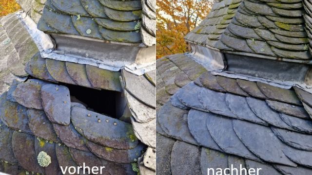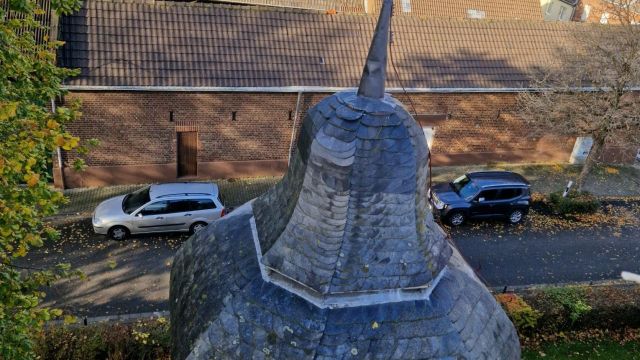 Der Zahn der Zeit hinterließ in den letzten 40 Jahren viele Spuren. Etliche Schieferplatten fehlten oder waren beschädigt. Im oberen Teil des Turmes waren offene Stellen und die Zinkornamente hatten Risse. Deshalb entschloss sich das Stadtteilforum im letzten Jahr, den Glockenturm zu sanieren. Mit Hilfe von Spenden, darunter eine vom RWE, konnte dieses Projekt erfolgreich abgeschlossen werden.