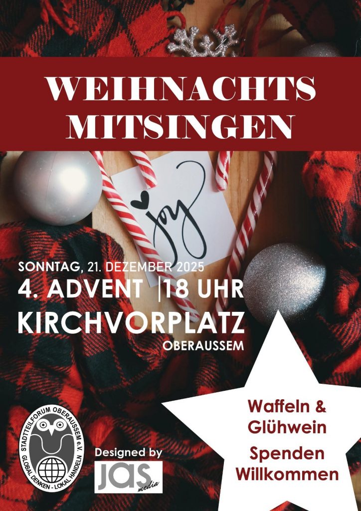 Bald ist es wieder soweit: Am 4. Advent, 21. Dezember 2025, lädt das Stadtteilforum Oberaußem wieder herzlich um 18.00 Uhr zum traditionellen Weihnachts-Mitsingen ein. Stimmen Sie mit uns gemeinsam festliche Lieder an und genießen Sie die besondere Atmosphäre in der Kirche.