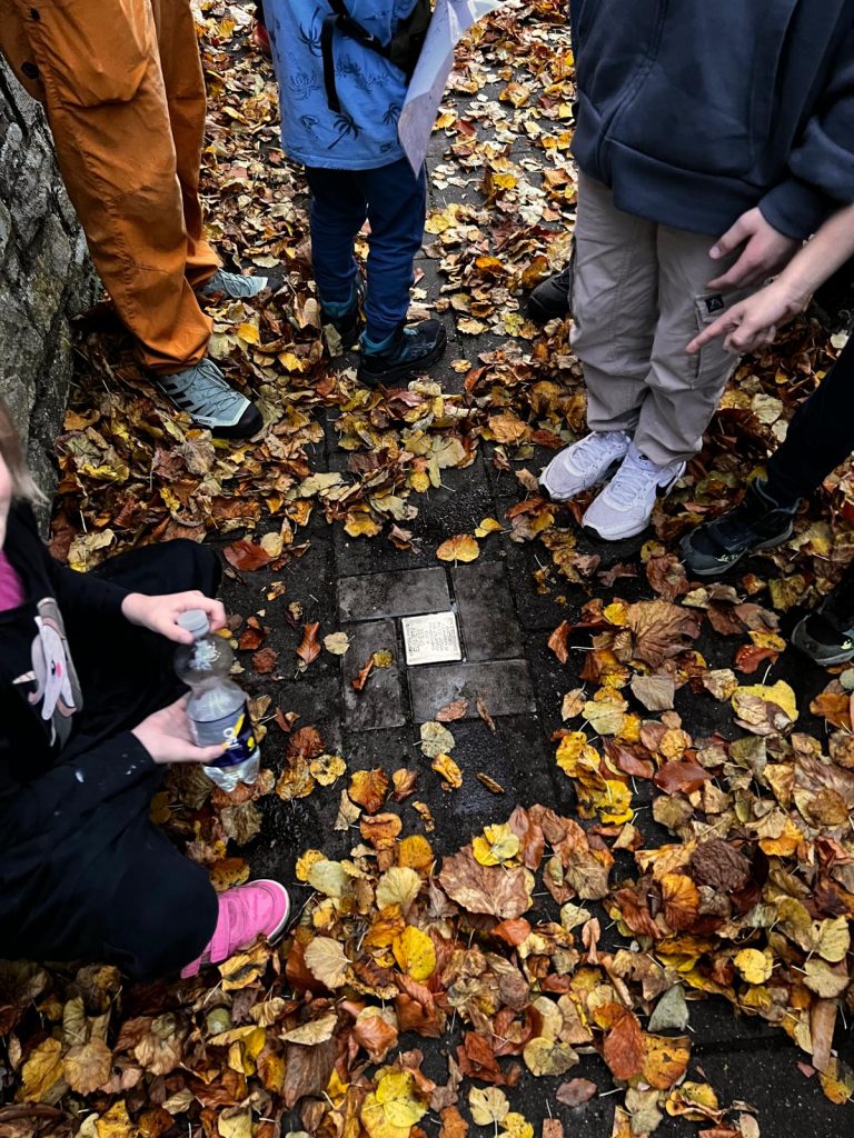 Um 16 Uhr begann die Aktion vor dem Haus: Am Berg 1. Die Stadtarchivarin, Frau Delbach, erklärte was hier Schreckliches geschah. Danach putzten die Kinder die 5 Stolpersteine der Familie Simons.