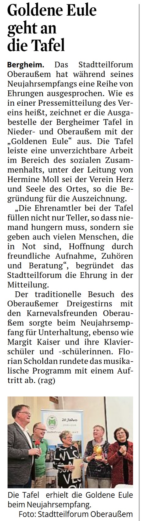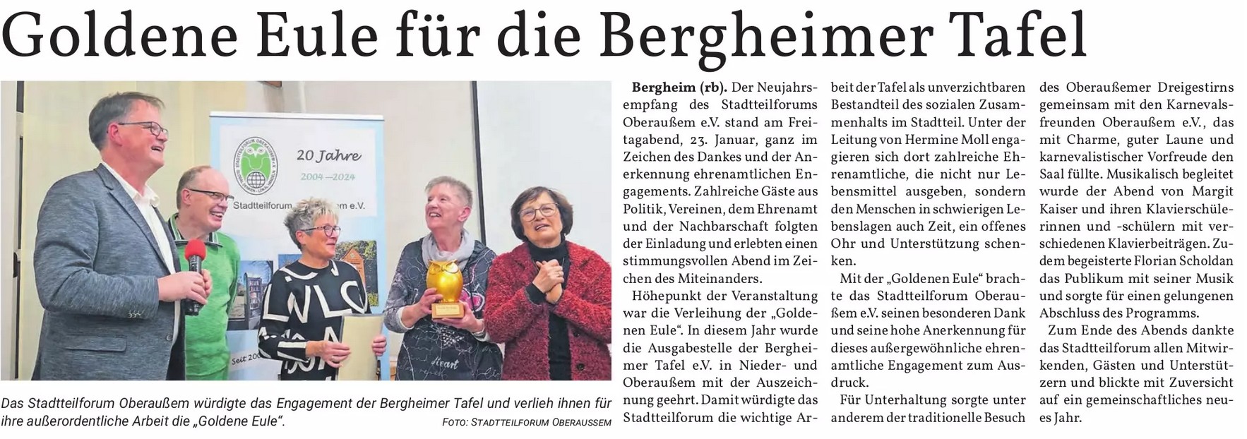 Neujahrsempfang – Verleihung der Goldenen Eule für die Tafel Ausgabestelle Nieder- und Oberaußem