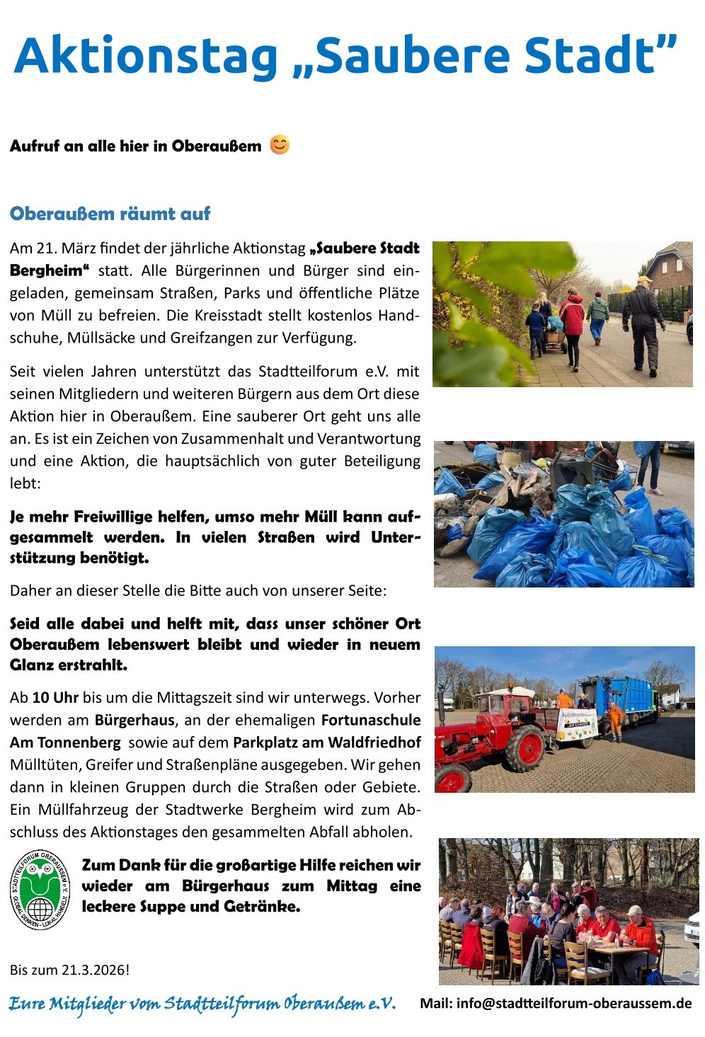 Am vergangenen Samstag, den 08.03., war es wieder soweit: Der Aktionstag „Saubere Stadt 2025“ fand bei strahlendem Sonnenschein statt und war ein voller Erfolg! Zahlreiche engagierte Bürgerinnen und Bürger aus unserem Ort packten tatkräftig mit an, um Straßen, Parks und Grünflächen von Müll zu befreien.