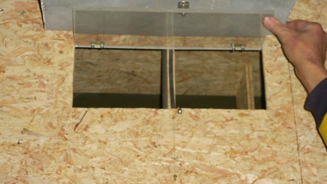 Auf Bild Nr. 1 aber noch besser zu erkennen. Auf Bild Nr. 2 ist das hochstehende Brett im Inneren des Nistkasten. Durch dieses Brett wird der Eingangsbereich vom Nistbereich abgetrennt. Das Plexiglas garantiert eine freie Sicht in den Brustkasten und kann mittels Tuch abgedeckt werden.