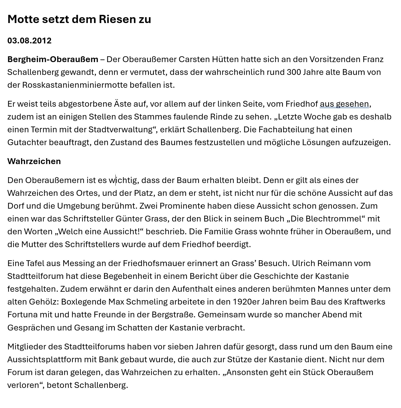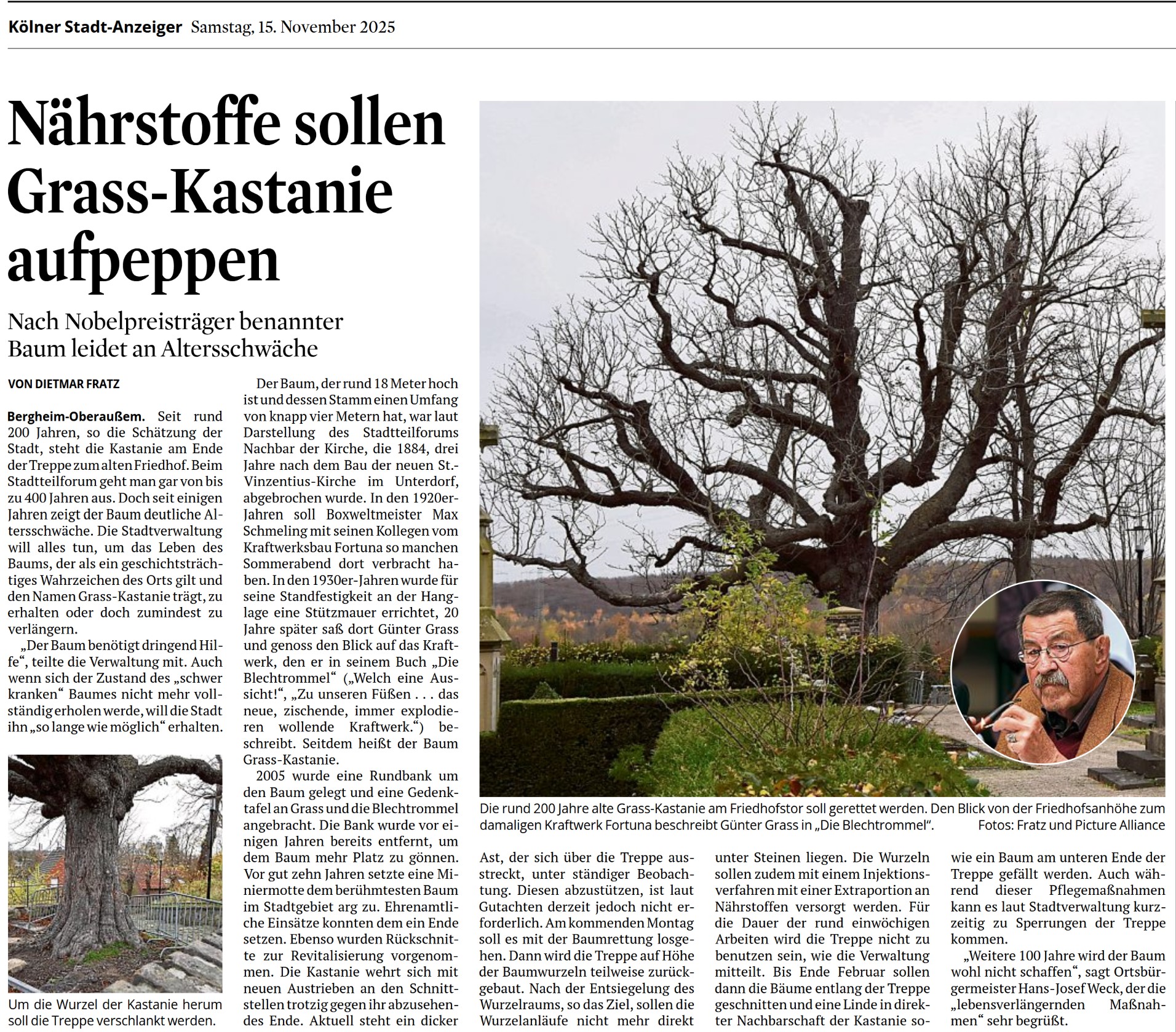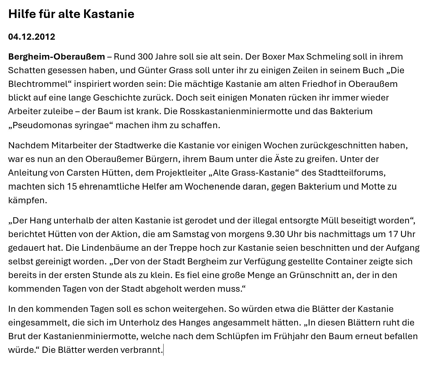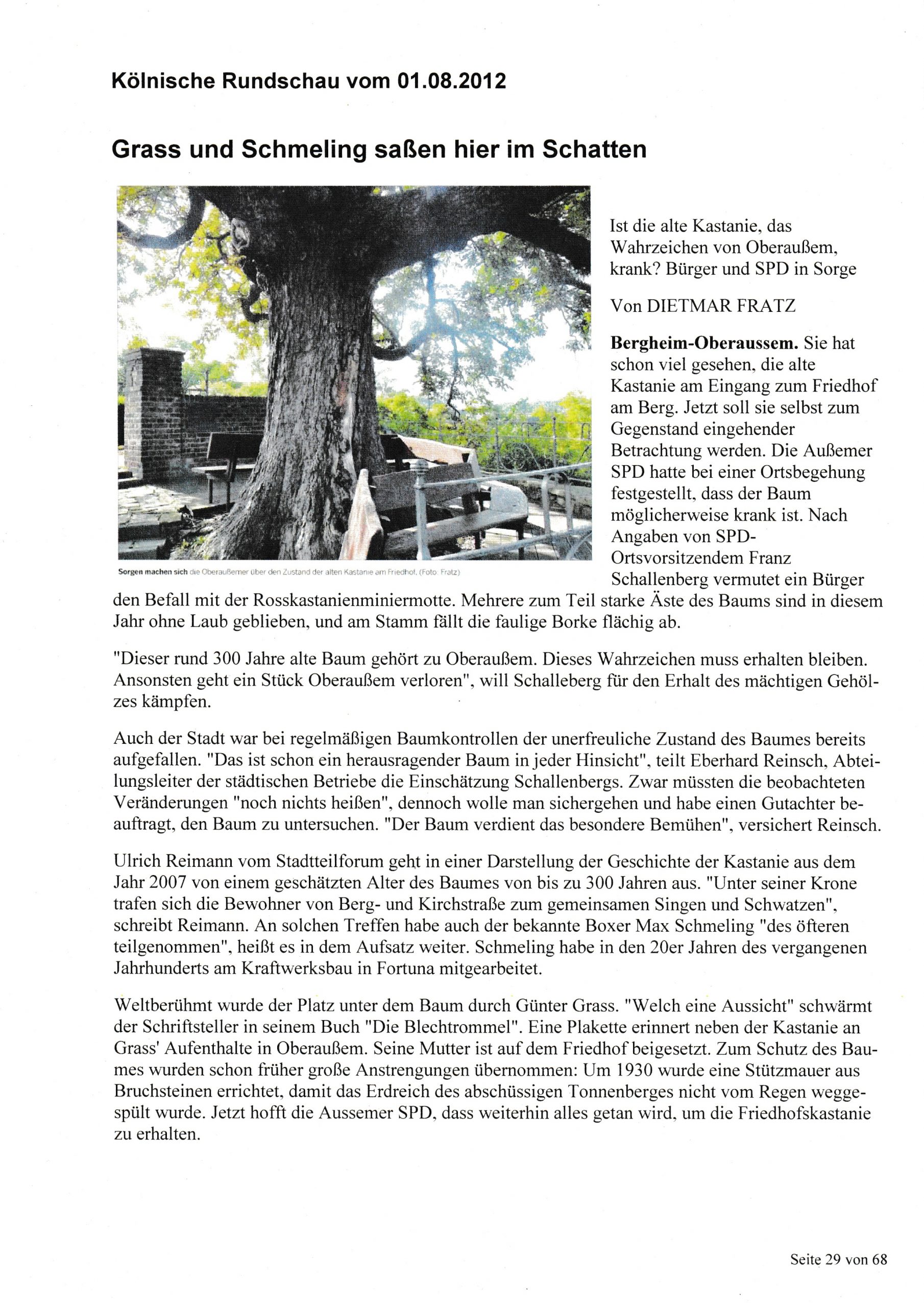 Der Baum bietet ein herrliche Aussicht über Oberaußem, die auch später Günter Grass so beeindruckte, dass er die Aussicht vom Plateau der Kastanie auf das Kraftwerk Fortuna Nord in seinem Nobelpreisgekröntem Buch „Die Blechtrommel“ beschrieb – „Welch eine Aussicht!“. Da Günter Grass die Kastanie und Oberaußem in die Weltliteratur gebracht hat, wird zu dessen Ehren der Baum seit einigen Jahren als „Grass-Kastanie“ bezeichnet. Auch eine Gedenktafel an der Friedhofsmauer neben dem Westeingangstor zum Friedhof erinnert an die Begebenheit.