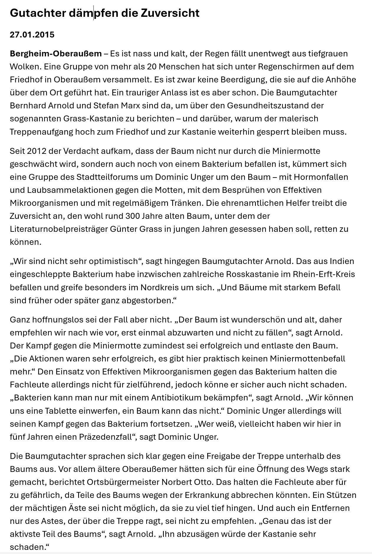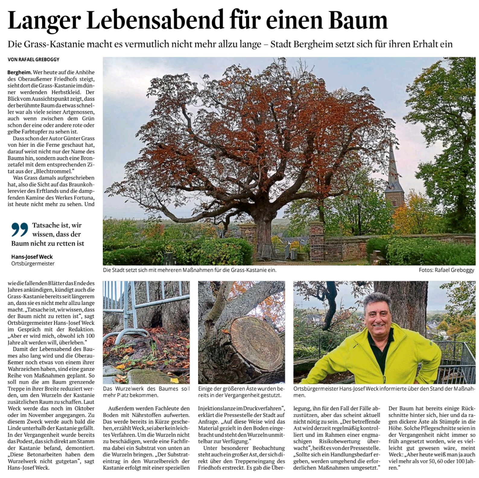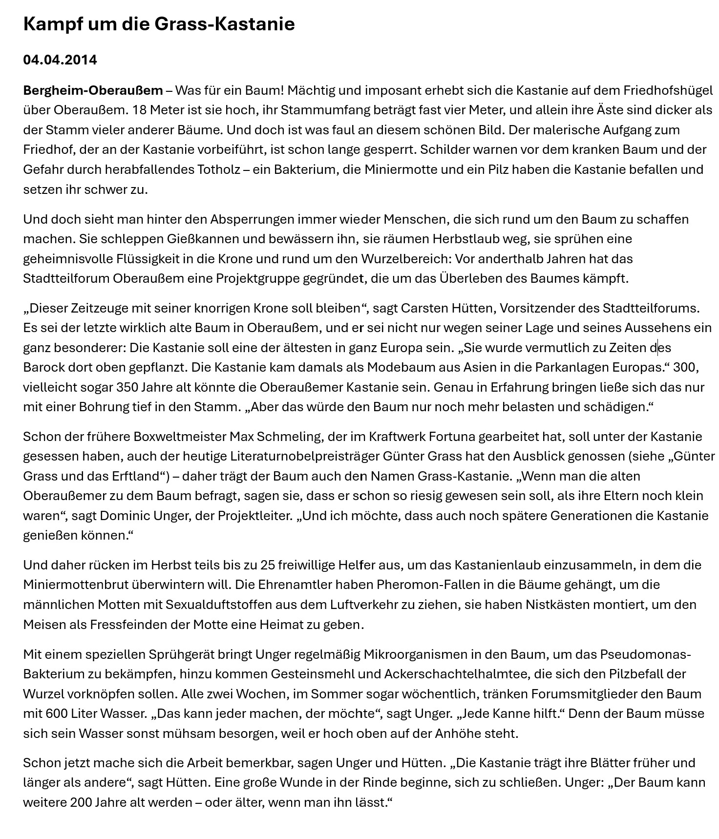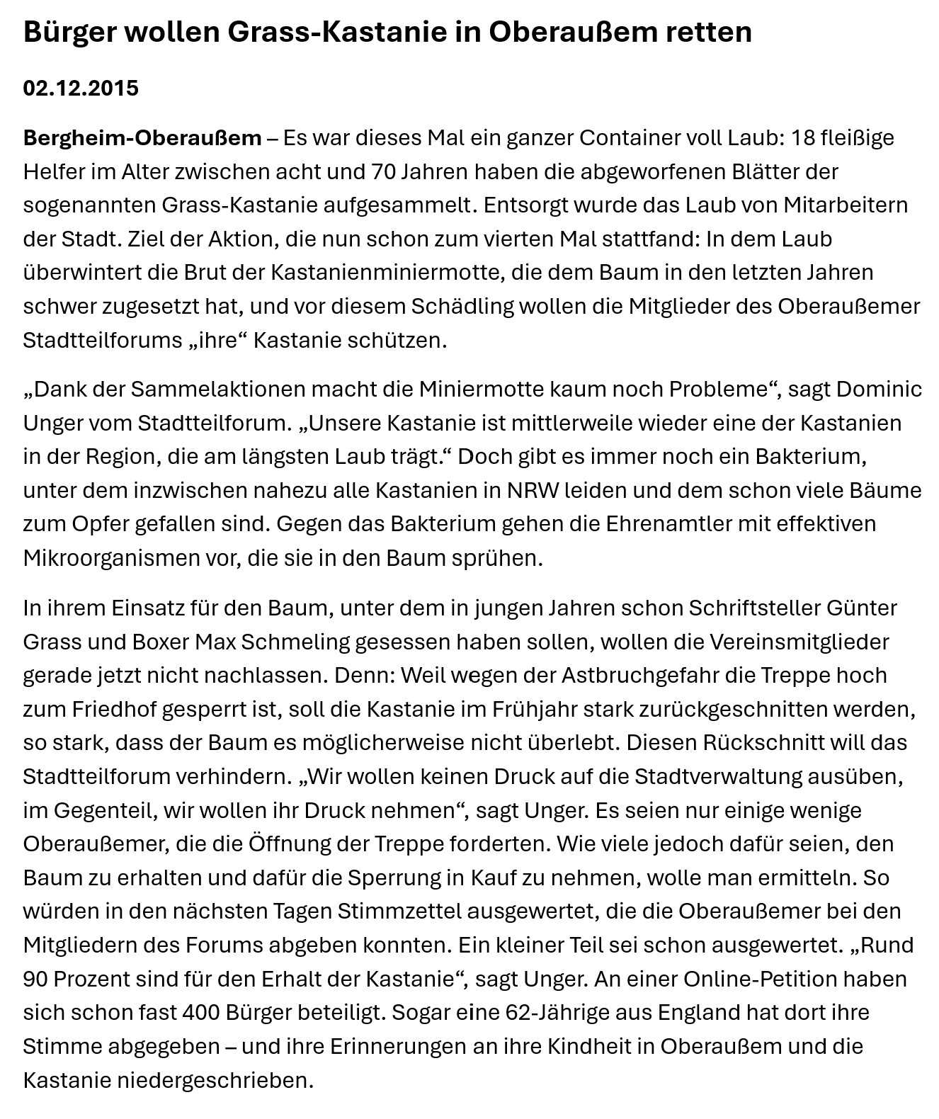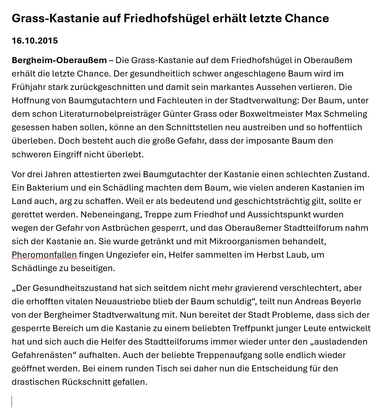 Der Baum bietet ein herrliche Aussicht über Oberaußem, die auch später Günter Grass so beeindruckte, dass er die Aussicht vom Plateau der Kastanie auf das Kraftwerk Fortuna Nord in seinem Nobelpreisgekröntem Buch „Die Blechtrommel“ beschrieb – „Welch eine Aussicht!“. Da Günter Grass die Kastanie und Oberaußem in die Weltliteratur gebracht hat, wird zu dessen Ehren der Baum seit einigen Jahren als „Grass-Kastanie“ bezeichnet. Auch eine Gedenktafel an der Friedhofsmauer neben dem Westeingangstor zum Friedhof erinnert an die Begebenheit.
