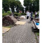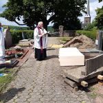Nachdem am 29. April 2022 die störenden Fundamentteile erfolgreich beseitigt werden konnte, fanden am Montag, 16. Mai 2022, die Arbeiten statt, um zukünftig die der Treppe leichter und ohne Mini-Bagger erledigen zu können. Beteiligt an diesen Arbeiten waren Norbert Schumacher, Bernd Gützlaff, Friedel Geist, Peter Brüggen, Hans Griese. In einem ersten Arbeitsschritt wurde das abdeckende Erdreich weiträumig abgetragen und links neben der Grabstätte von Pfarrer Thomas Zensus gelagert. Die drei Betonplatten ließen sich anschließend problemlos entfernen. Als letzte konnte die freiliegende Öffnung mit einer großen Holzplatte abgedeckt und mit übereinander gestapelten Betonplatten beschwert geschlossen werden. Die Baustelle wurde mit Flatterband gesichert.