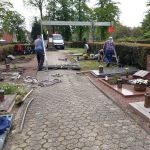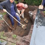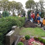 Die Mitarbeiter der Firma Plinz entfernten zunächst die 2 Elemente der Grabeinfassung links und vorne und das ca. 20-30 cm lange Verbindungselement zwischen linker Einfassung und Grabstein sowie die linke Grabplatte und lagerten sie auf der gegenüberliegenden Seite des Weges. Die störenden Betonteile wurden zerkleinert und entfernt. Die Freilegung erfolgte mit einem Minibagger von Friedel Geist. Das Entfernen der Treppenabdeckung (Steinplatten) war nicht geplant und auch nicht erforderlich.